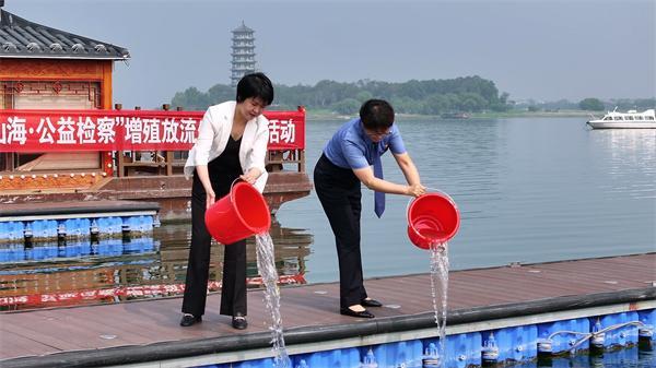 為推進“燕趙山?!す鏅z察”護航美麗河北建設專項監(jiān)督繼續(xù)走深走實,河北省磁縣人民檢察院近日邀請縣政協(xié)委員在溢泉湖濕地公園開展增殖放流活動。圖為檢察干警和政協(xié)委員放生鰱鳙魚苗。