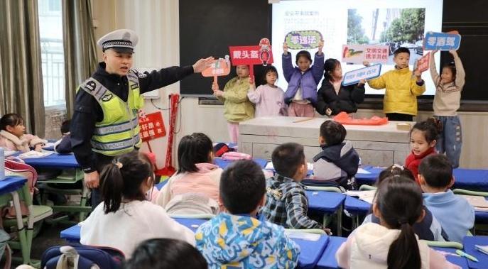 11月20日,江西省九江市公安局交管支隊(duì)第一大隊(duì)組織民警到轄區(qū)東鳳小學(xué)開展交通安全宣傳活動。圖為民警給學(xué)生們上交通安全課。