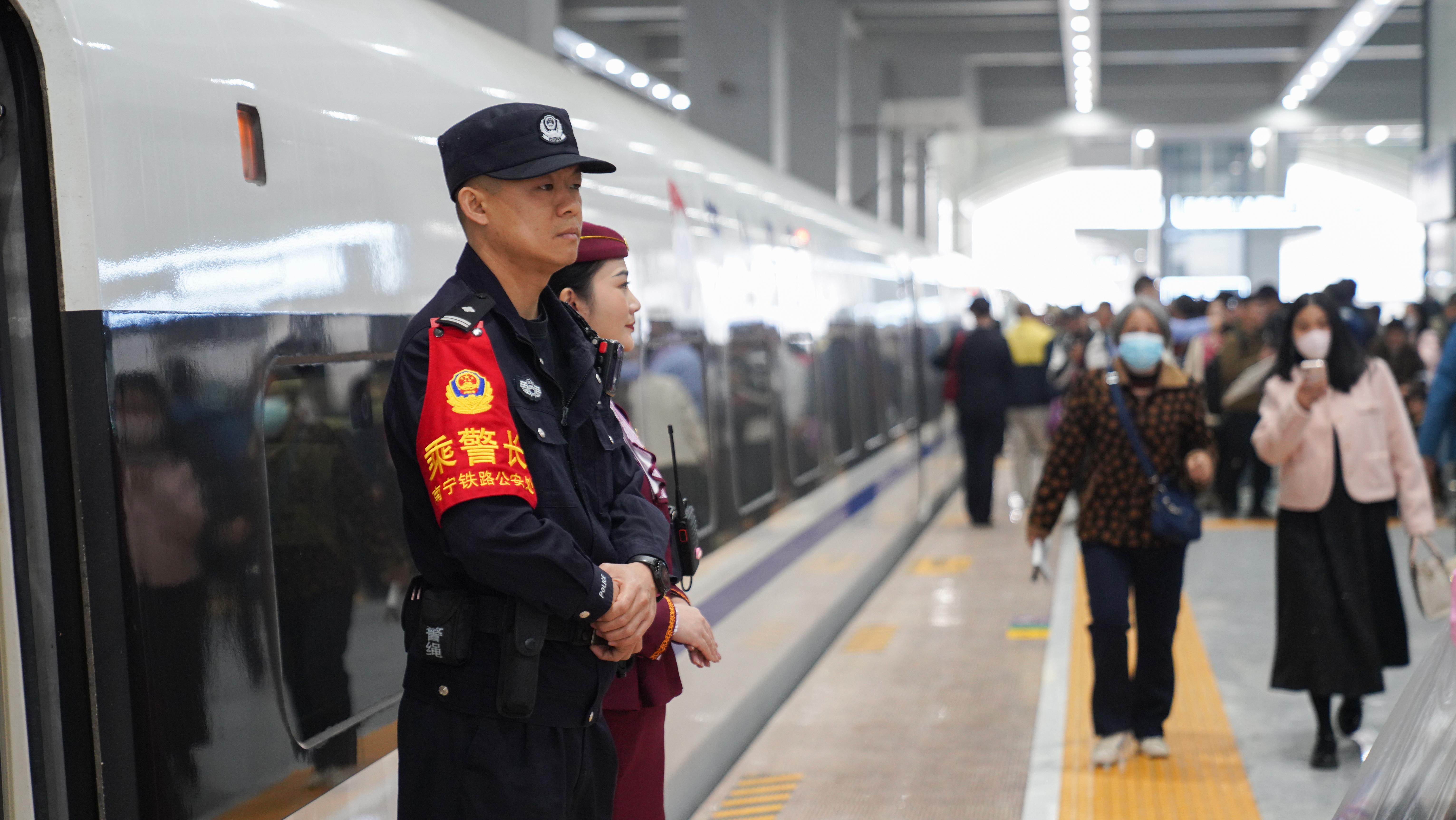 近日,南珠高鐵南寧至玉林段開通運營。南寧鐵路公安局南寧公安處民警全力護航南珠高鐵平安運行。圖為首發(fā)列車G5514次列車靠站,乘警在站臺維護秩序。