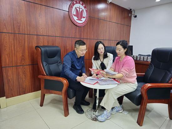 圖為周秋妤(右一)和同事一起對(duì)疑難復(fù)雜案件進(jìn)行合議,研究實(shí)質(zhì)化解行政爭(zhēng)議路徑。 廣州市司法局供圖