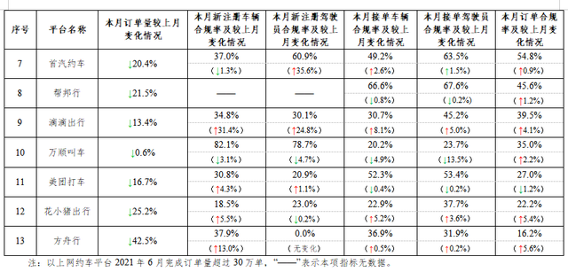 一、在訂單量超過30萬單的網(wǎng)約車平臺中,訂單合規(guī)率最高的是如祺出行,最低的是方舟行。2021年6月訂單量超過30萬單的網(wǎng)約車平臺共13家。與5月份相比,招招出行、東風(fēng)出行從5月訂單量超過30萬單降到30萬單以下。按訂單合規(guī)率(指駕駛員和車輛均獲得許可的訂單量占比)從高到低的分別是如祺出行、享道出行、T3出行、神州專車、陽光出行、曹操出行、首汽約車、幫邦行、滴滴出行、萬順叫車、美團(tuán)打車、花小豬出行、方舟行。本月訂單合規(guī)率增長排名前3名的分別是如祺出行、方舟行、花小豬出行;下降最多的分別是曹操出行、享道出行、美團(tuán)打車。