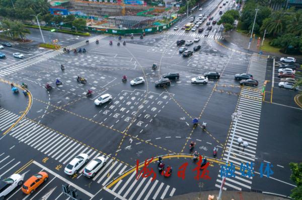 ??谑袊?guó)興大道與五指山路交叉口采取路口全向過(guò)街方式。??谌?qǐng)?bào)記者 石中華 攝