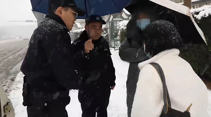 圖為濟(jì)南市公安局市中區(qū)分局大觀園派出所民警幫助賈女士找回雪中乘錯車的孩子。