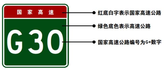例如下圖所示是我國(guó)的最長(zhǎng)的一條高速公路G30連霍高速(連云港至霍爾果斯高速公路)的標(biāo)識(shí)。其上方是紅底白字,標(biāo)識(shí)“國(guó)家高速”,連霍高速是一條東西橫線,下方編號(hào)為國(guó)道標(biāo)識(shí)符G和兩位偶數(shù)30。
