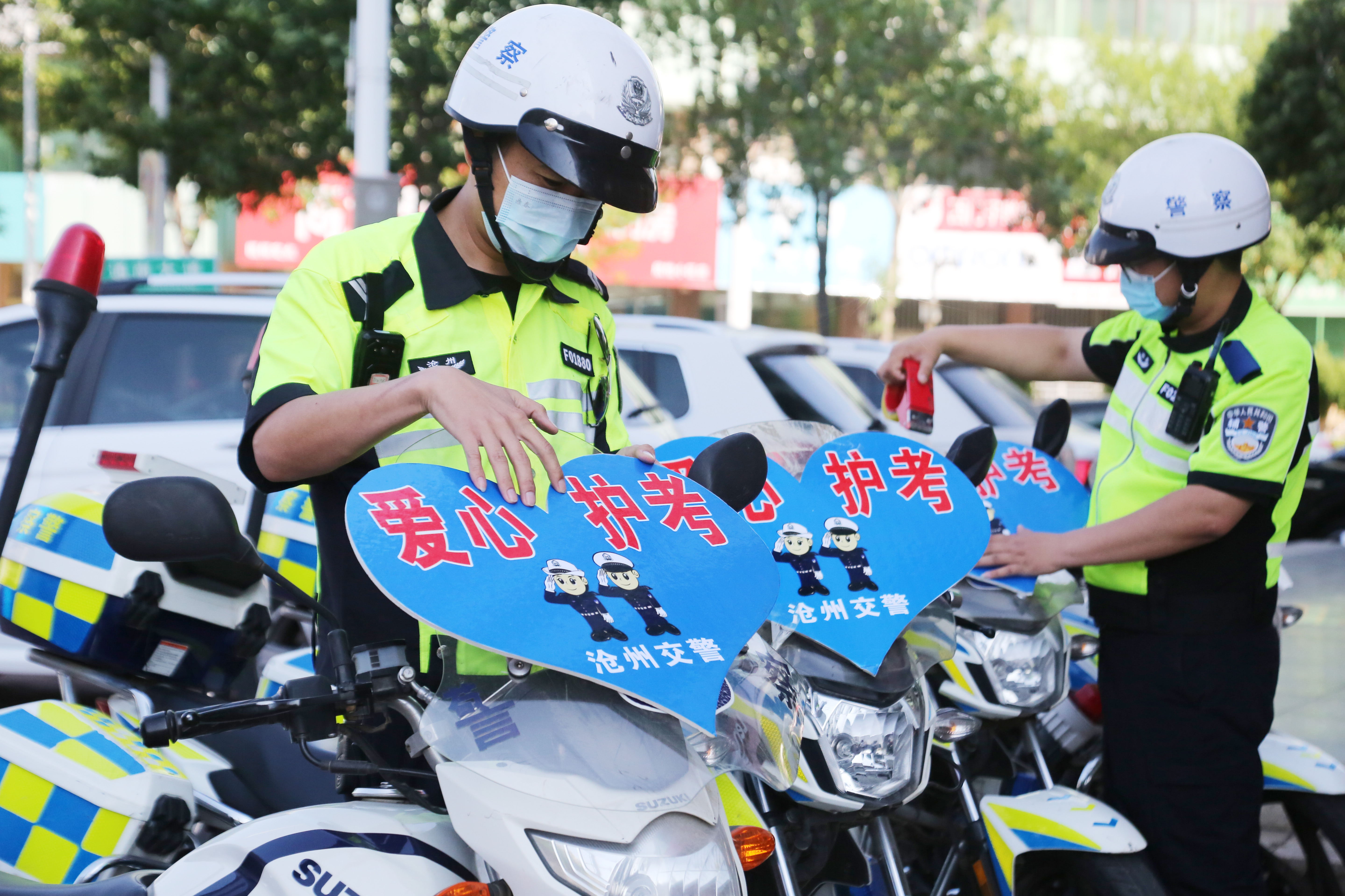 高考在即,河北省滄州市交警提前部署高考護(hù)考管控措施,參加維護(hù)高考交通秩序和護(hù)送考生車輛的執(zhí)勤交警提前進(jìn)入高考狀態(tài),以良好的精神狀態(tài)為高考學(xué)子和接送考生的車輛“護(hù)航”。圖為滄州市公安交警支隊(duì)二大隊(duì)鐵騎交警提前行動,細(xì)心檢查摩托車機(jī)械運(yùn)行狀況、粘貼“愛心護(hù)考”標(biāo)識牌,“備戰(zhàn)”高考。