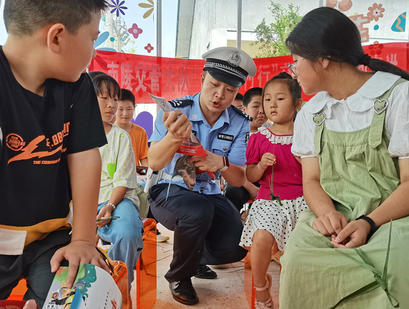 8月15日,安徽省南陵縣公安局交管大隊民輔警在轄區(qū)兒童中開展交通安全宣傳活動,增強他們知危險、會避險意識。