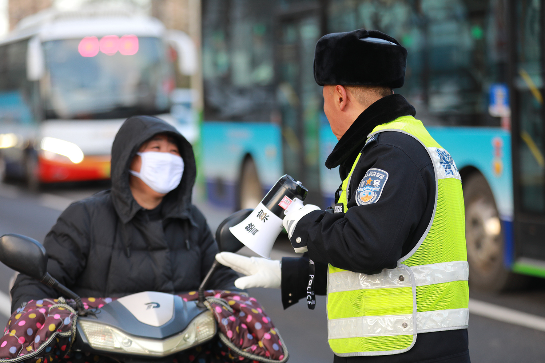 11月16日,遼寧省阜新市公安局交警支隊(duì)海州大隊(duì)民警持“小喇叭”上崗執(zhí)勤,在路口勸導(dǎo)電動(dòng)自行車駕乘人員佩戴安全頭盔出行。
