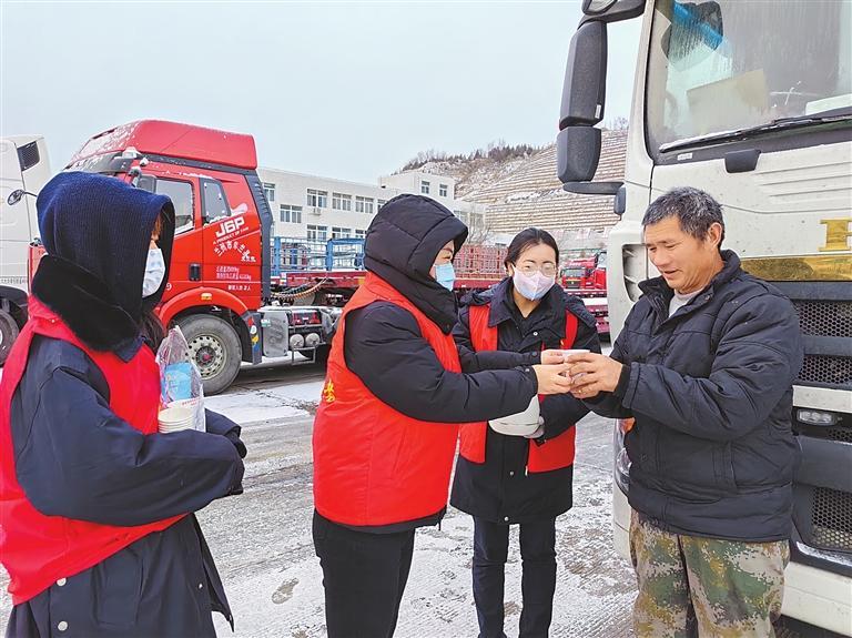 近日,甘肅省高速公路服務集團志愿者在服務區(qū)為貨車司機“送溫暖”。華運高速公路服務區(qū)管理有限公司供圖
