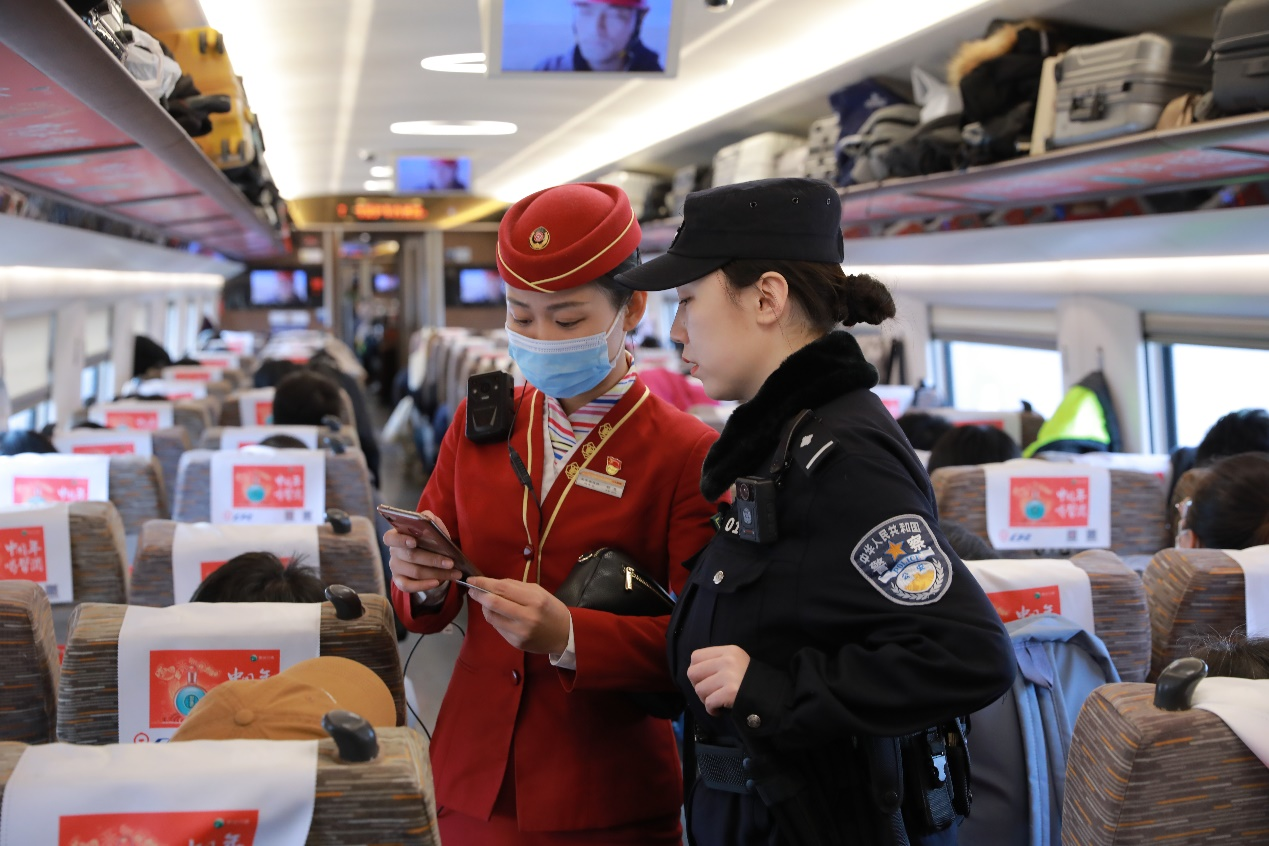 今年,北京鐵路公安處乘警支隊(duì)女子乘警隊(duì)首次參加春運(yùn)值乘任務(wù),主要值乘管內(nèi)京滬線上的部分高鐵列車。她們堅(jiān)守工作崗位落實(shí)各項(xiàng)安保任務(wù),并向旅客發(fā)放反詐宣傳冊(cè)、宣講反詐常識(shí)等。圖為G9高鐵上,乘警紀(jì)明月與當(dāng)次列車長(zhǎng)一起進(jìn)行車內(nèi)巡檢。