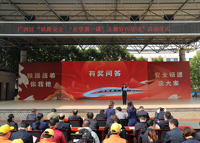 活動(dòng)現(xiàn)場(chǎng),錦華小學(xué)學(xué)生“紅領(lǐng)巾護(hù)路隊(duì)”代表宣讀愛(ài)路護(hù)路倡議書(shū);學(xué)生表演《愛(ài)路護(hù)路我能行》節(jié)目,以快板和舞蹈的形式宣傳鐵路安全知識(shí);鐵路青年志愿者通過(guò)護(hù)路快板表演,將鐵路安全小知識(shí)改編成朗朗上口的順口溜,讓人印象深刻;南寧站派出所民警上臺(tái)講解鐵路安全注意事項(xiàng),進(jìn)一步提升未成年人法律意識(shí)和安全意識(shí)。