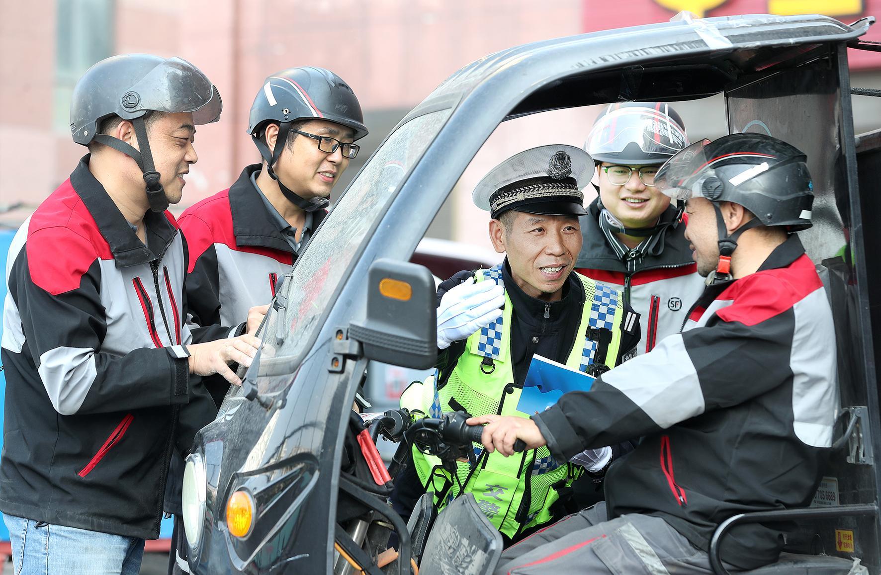 11月11日中午,湖北省荊門市公安局交警支隊東寶大隊民警在一家快遞公司,叮囑快遞“小哥”攬件、送件從“頭”做起,保護好自己以及他人的生命財產(chǎn)安全。