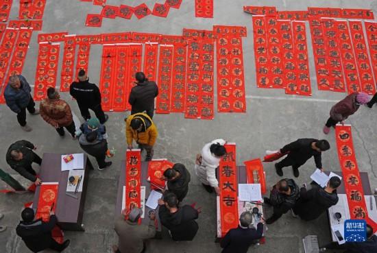 春節(jié)臨近,多地組織書法志愿者走進(jìn)社區(qū)、工地等場(chǎng)所,為人們書寫春聯(lián)和福字,迎接春節(jié)的到來。