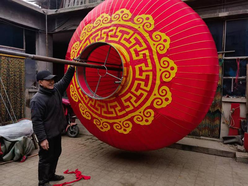 “這個規(guī)格是3米的,算是中等大小?!卑总娖绞炀毜?fù)伍_了一個大紅燈籠。打小跟老人學(xué)燈籠技藝,白軍平最擅長制作各種規(guī)格的大燈籠。