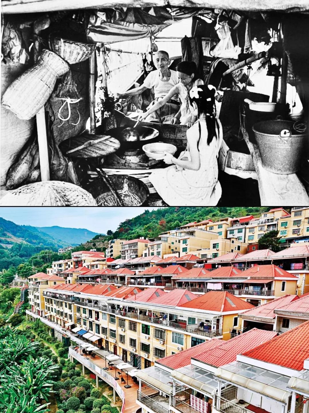 在福建省寧德市福安市下岐村,歷史上,村民祖祖輩輩以在淺海灘涂“討小?!睘樯?,一條小木船就是幾代人的家,生活條件異常艱苦,被稱為“連家船民”。20世紀(jì)90年代,福建“造福工程”啟動(dòng),下岐村采取“分期分批,全面搬遷”的辦法,將2000多名漁民安置上岸。如今的下岐村,成排的小洋樓矗立,漁民廣場、白馬公園等休閑設(shè)施一應(yīng)俱全,呈現(xiàn)出一幅百姓安居樂業(yè)的現(xiàn)代鄉(xiāng)村圖景。圖為拼版照片:上圖為20世紀(jì)80年代福建寧德地區(qū)的連家船民生活場景(資料照片);下圖為2023年11月15日拍攝的下岐村(新華社記者 姜克紅/攝)。 新華社發(fā)