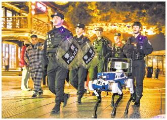 圖為杭州西湖斷橋上,西湖景區(qū)公安AI警隊隊員人形機(jī)器人協(xié)同機(jī)器狗同步現(xiàn)身。 王剛 攝