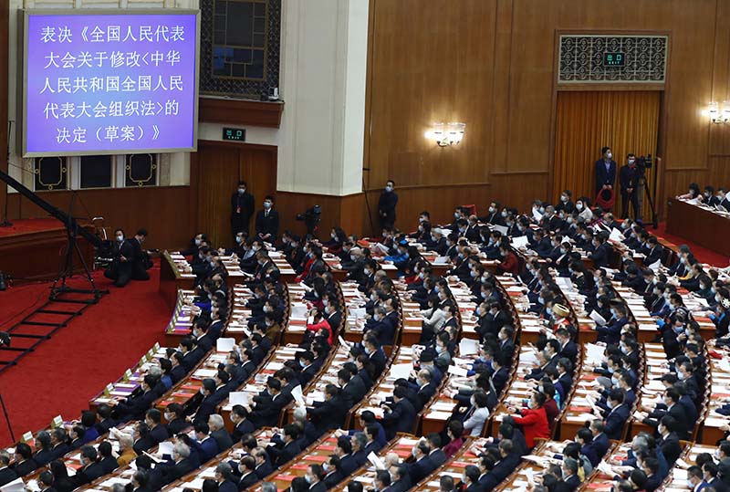 2021年3月11日,十三屆全國人大四次會議在北京人民大會堂閉幕。此次會議對全國人民代表大會組織法、全國人民代表大會議事規(guī)則作出修改。 新華社記者 張玉薇 攝