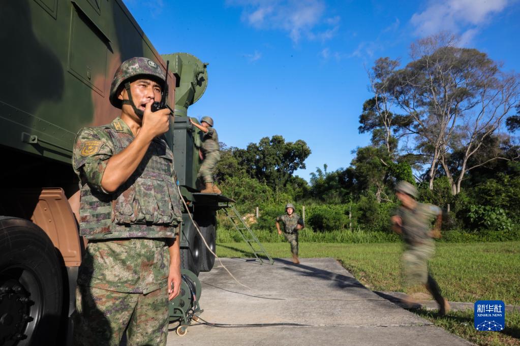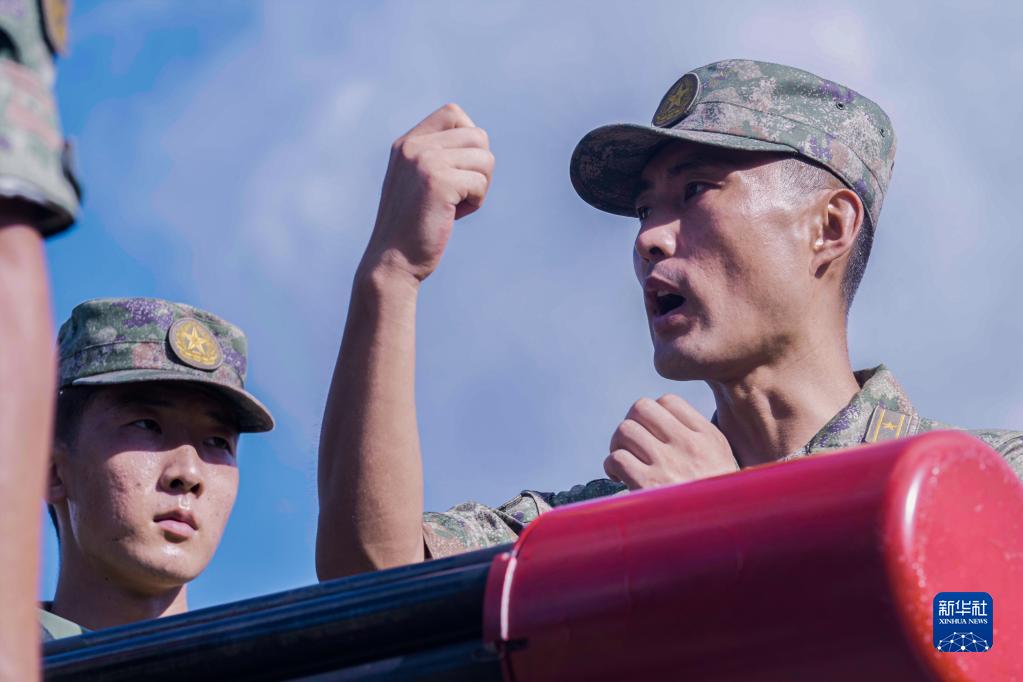 駐香港部隊(duì)某團(tuán)防空營營長王海旭(左)在訓(xùn)練中下達(dá)作戰(zhàn)指令(2022年7月21日攝)。新華社發(fā)(田越洋 攝)