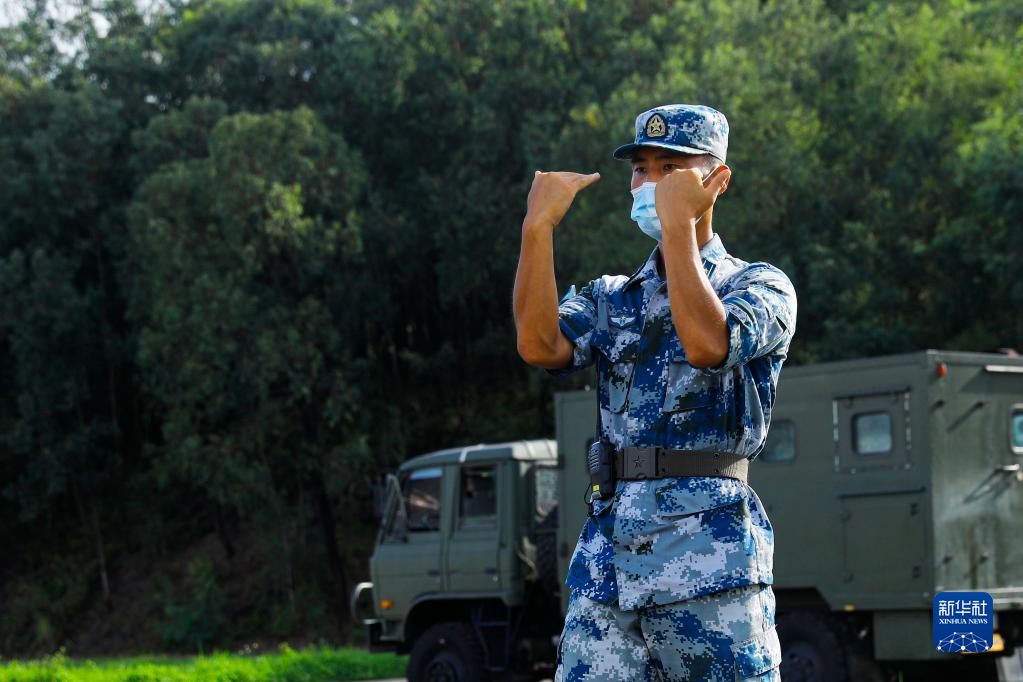 駐香港部隊(duì)某團(tuán)防空營營長王海旭在防空陣地上指揮戰(zhàn)斗裝備進(jìn)入預(yù)定區(qū)域(2020年8月13日攝)。新華社發(fā)(田越洋 攝)
