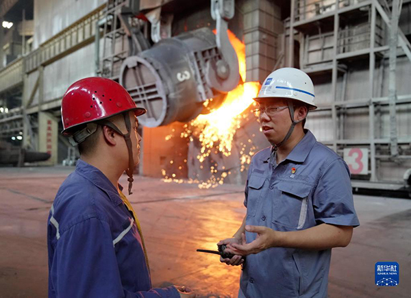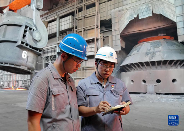 邯寶煉鋼廠特檔技術(shù)主管、轉(zhuǎn)爐車(chē)間副主任唐笑宇(右)在轉(zhuǎn)爐車(chē)間與工友交流(2022年9月7日攝)。新華社記者 楊世堯 攝