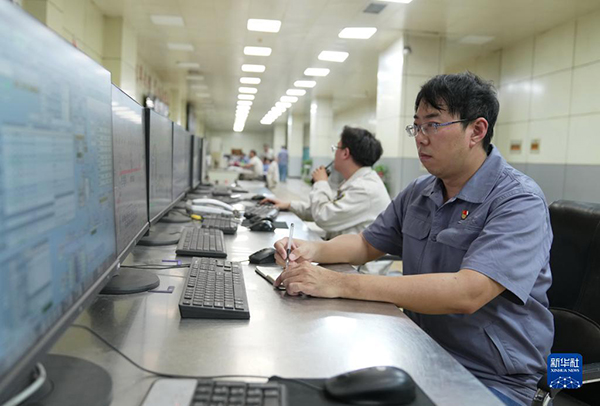 邯寶煉鋼廠特檔技術(shù)主管、轉(zhuǎn)爐車(chē)間副主任唐笑宇(右)在轉(zhuǎn)爐車(chē)間控制室工作(2022年9月7日攝)。新華社記者 楊世堯 攝