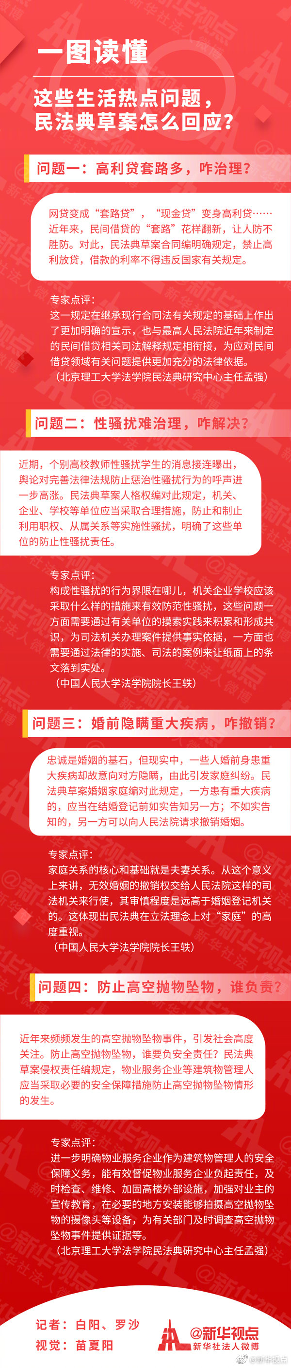 由民法典各分編草案與民法總則“合體”而成的民法典草案,23日于十三屆全國人大常委會第十五次會議上亮相。明確禁止高利放貸、完善防止性騷擾有關(guān)規(guī)定、合理確定無效婚姻的情形、完善高空拋物墜物責任規(guī)則......這些生活中的熱點問題,民法典草案都予以明確回應。