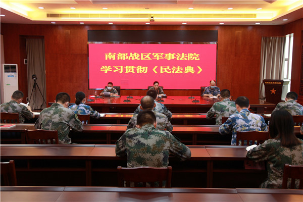南部戰(zhàn)區(qū)軍事法院召開專題黨委會,認真學(xué)習(xí)習(xí)近平主席在中央政治局第二十次集體學(xué)習(xí)時的重要講話、全國法院學(xué)習(xí)貫徹2020年全國兩會精神視頻會議精神和民法典,專題部署推動戰(zhàn)區(qū)兩級軍事法院和轄區(qū)部隊民法典學(xué)習(xí)宣傳貫徹工作,要求戰(zhàn)區(qū)兩級軍事法院在學(xué)習(xí)宣傳貫徹民法典中走在前列,為部隊和官兵樹好標(biāo)桿;準(zhǔn)確理解和把握民法典立法精神、條文含義和最新內(nèi)容,提高運用民法典維護官兵權(quán)益、化解矛盾糾紛、促進部隊和社會和諧穩(wěn)定的能力;把深入宣傳貫徹民法典作為當(dāng)前和今后一個時期的工作重點,在戰(zhàn)區(qū)部隊營造尊法學(xué)法守法用法的濃厚氛圍。