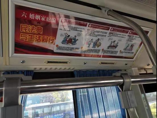 在宣傳《民法典》公交車車體內(nèi)外,精心營造學(xué)習(xí)宣傳《民法典》的濃厚氛圍,將《民法典》公交專線主題設(shè)計為“《民法典》與生活同行”,車體以紅色為主基調(diào),圖文并茂,視覺沖擊力強。車內(nèi)兩側(cè)、坐椅靠背、車廂展板等位置進行了全方位包裝,車內(nèi)移動電視持續(xù)播放《民法典》宣傳短視頻,展示《民法典》中見義勇為免責(zé)、小區(qū)共有場地收入歸業(yè)主、夫妻共同債務(wù)如何界定等與百姓生活息息相關(guān)的法條。乘客在乘車的同時,可以感受到學(xué)習(xí)《民法典》的樂趣和必要性。