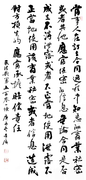 民法典第五百零一條 當(dāng)事人在訂立合同過程中知悉的商業(yè)秘密或者其他應(yīng)當(dāng)保密的信息,無論合同是否成立,不得泄露或者不正當(dāng)?shù)厥褂?;泄露、不正?dāng)?shù)厥褂迷撋虡I(yè)秘密或者信息,造成對方損失的,應(yīng)當(dāng)承擔(dān)賠償責(zé)任。