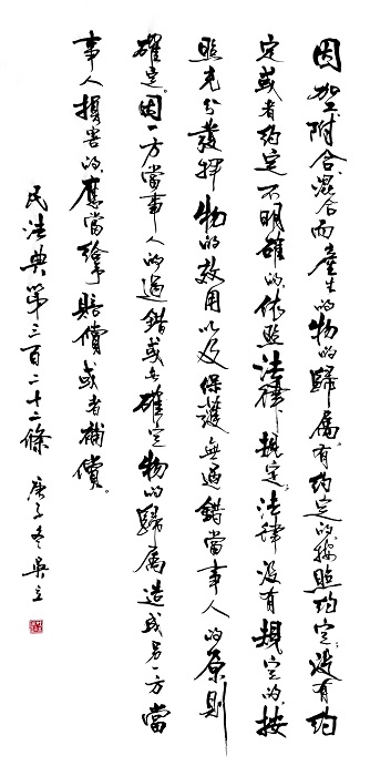 民法典第三百二十二條 因加工、附合、混合而產(chǎn)生的物的歸屬,有約定的,按照約定;沒有約定或者約定不明確的,依照法律規(guī)定;法律沒有規(guī)定的,按照充分發(fā)揮物的效用以及保護(hù)無過錯(cuò)當(dāng)事人的原則確定。因一方當(dāng)事人的過錯(cuò)或者確定物的歸屬造成另一方當(dāng)事人損害的,應(yīng)當(dāng)給予賠償或者補(bǔ)償。