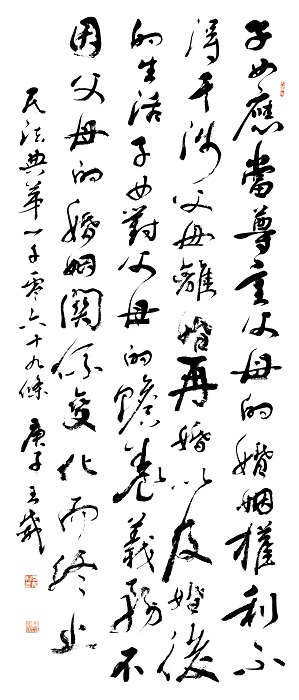 民法典第一千零六十九條 子女應(yīng)當(dāng)尊重父母的婚姻權(quán)利,不得干涉父母離婚、再婚以及婚后的生活。子女對(duì)父母的贍養(yǎng)義務(wù),不因父母的婚姻關(guān)系變化而終止。