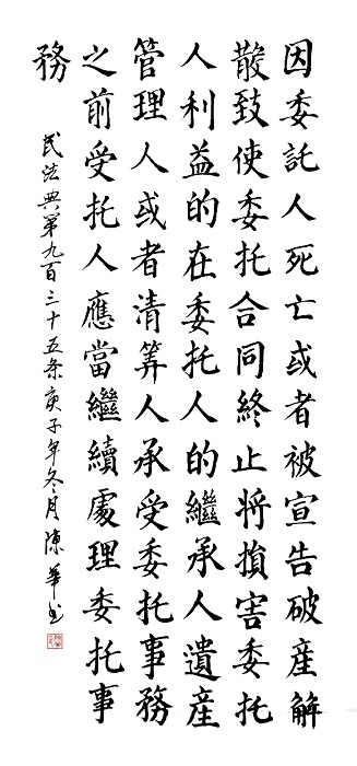 民法典第九百三十五條 因委托人死亡或者被宣告破產(chǎn)、解散,致使委托合同終止將損害委托人利益的,在委托人的繼承人、遺產(chǎn)管理人或者清算人承受委托事務(wù)之前,受托人應(yīng)當(dāng)繼續(xù)處理委托事務(wù)。