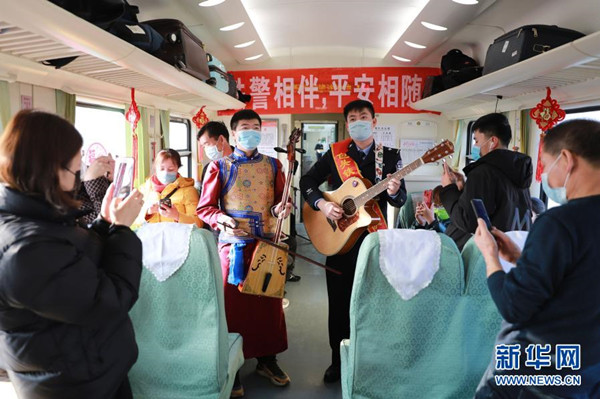 1月25日,包頭鐵路公安處民警(右)在列車上與旅客共同表演文藝節(jié)目?!?/span>