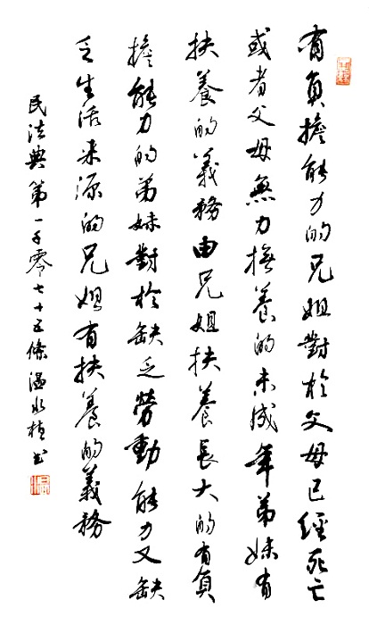 民法典第一千零七十五條 有負(fù)擔(dān)能力的兄、姐,對于父母已經(jīng)死亡或者父母無力撫養(yǎng)的未成年弟、妹,有扶養(yǎng)的義務(wù)。
