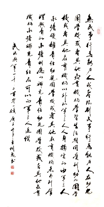 民法典第一千二百零一條 無民事行為能力人或者限制民事行為能力人在幼兒園、學(xué)?;蛘咂渌逃龣C(jī)構(gòu)學(xué)習(xí)、生活期間,受到幼兒園、學(xué)?;蛘咂渌逃龣C(jī)構(gòu)以外的第三人人身損害的,由第三人承擔(dān)侵權(quán)責(zé)任;幼兒園、學(xué)?;蛘咂渌逃龣C(jī)構(gòu)未盡到管理職責(zé)的,承擔(dān)相應(yīng)的補(bǔ)充責(zé)任。幼兒園、學(xué)校或者其他教育機(jī)構(gòu)承擔(dān)補(bǔ)充責(zé)任后,可以向第三人追償。