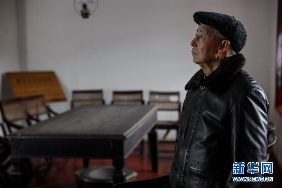 1月27日,83歲的遵義會(huì)議紀(jì)念館原副館長(zhǎng)田興詠在遵義會(huì)議召開(kāi)的長(zhǎng)方桌前口述歷史。新華社記者 歐東衢 攝