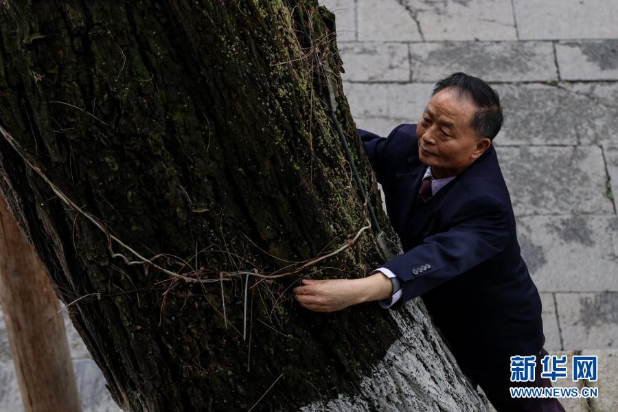 1月27日,67歲的“樹(shù)醫(yī)生”張本光在查看遵義會(huì)議會(huì)址前槐樹(shù)的生長(zhǎng)狀況。新華社記者 歐東衢 攝