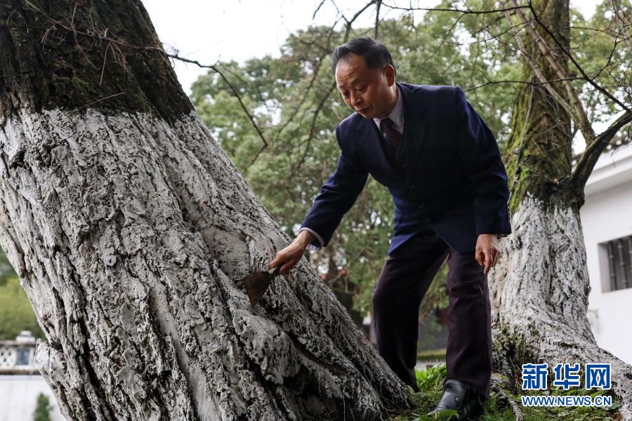 1月27日,67歲的“樹(shù)醫(yī)生”張本光在養(yǎng)護(hù)遵義會(huì)議會(huì)址前的槐樹(shù)。新華社記者 歐東衢 攝