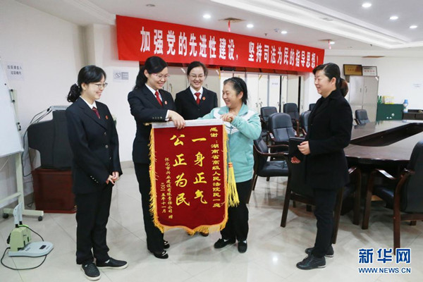 周春梅(左二)接過當(dāng)事人贈送的錦旗(資料照片)。新華社發(fā)