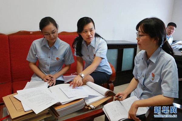 周春梅(中)與同事討論案情(資料照片)。新華社發(fā)