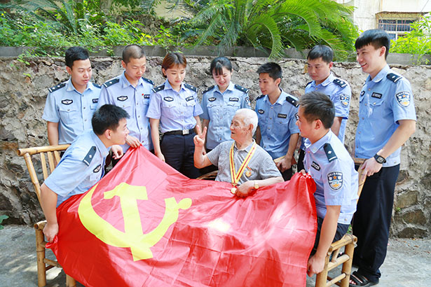 近日,江西省贛州市于都縣公安局組織部分青年黨員民警和入黨積極分子來(lái)到貢江鎮(zhèn)長(zhǎng)龍社區(qū),看望抗戰(zhàn)老兵萬(wàn)更志,聆聽(tīng)老黨員講述抗日戰(zhàn)爭(zhēng)的經(jīng)歷和黨的發(fā)展歷史。