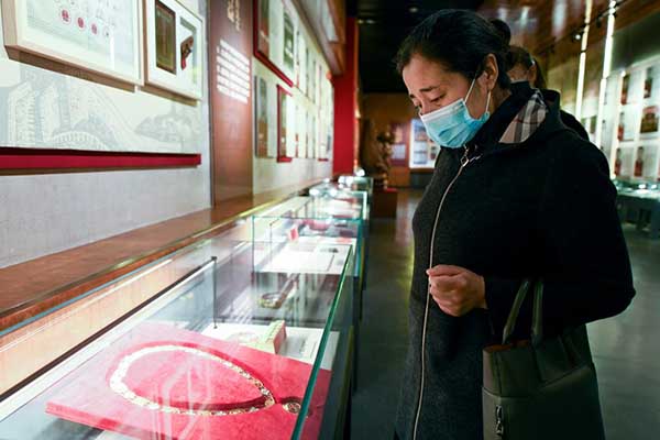 2021年4月3日,在新疆警史館,瑪依努爾在愛人艾熱提的雕像前擺上菊花。新華社記者 王菲 攝