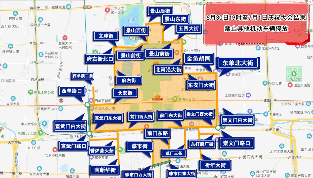 6月30日19時至7月1日慶祝大會結(jié)束,由府右街北口經(jīng)府右街、長安街、西單路口(不含)、宣武門內(nèi)大街(不含)、宣武門路口(不含)、宣武門東大街、前門西大街、煤市街、珠市口西大街(不含)、珠市口東大街(不含)、前門東路、前門東大街、崇文門西大街、崇文門路口(不含)、崇文門內(nèi)大街、東單北大街、金魚胡同、東安門大街、北河沿大街、五四大街、景山前街、景山東街、景山后街、景山西街、景山前街、文津街至府右街北口以內(nèi)區(qū)域、西單橫二條、祈年大街、東打磨廠街、南新華街、香爐營頭條、草廠三條、前門肯德基停車場,除持有慶祝大會專用證件的車輛外,禁止其他機(jī)動車輛停放。