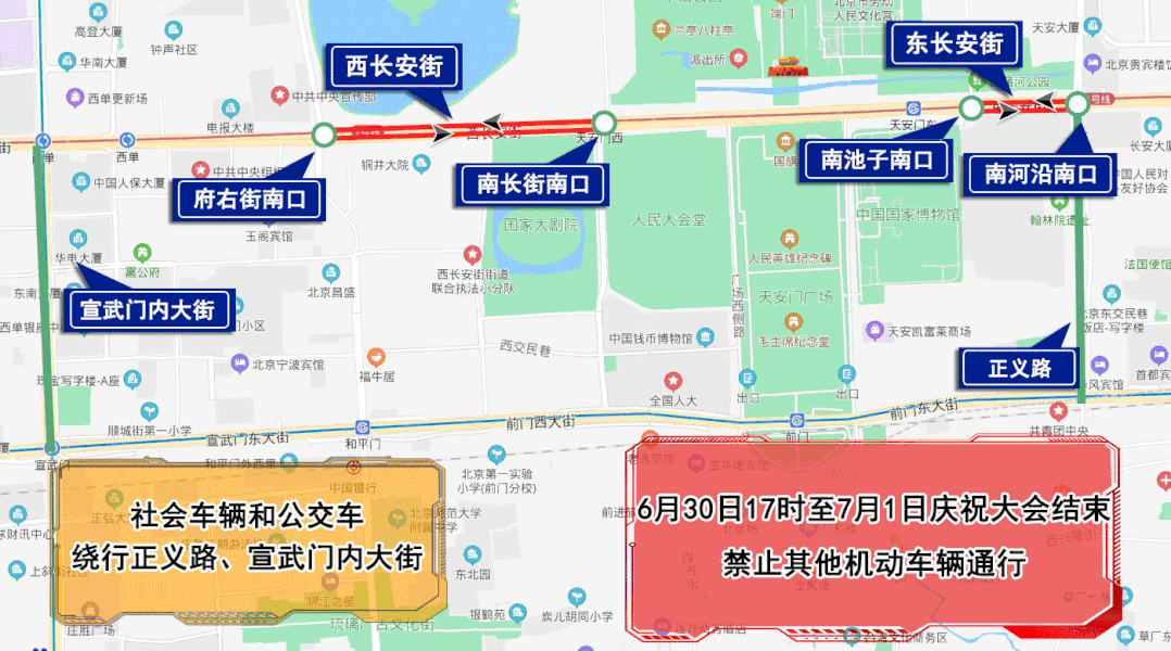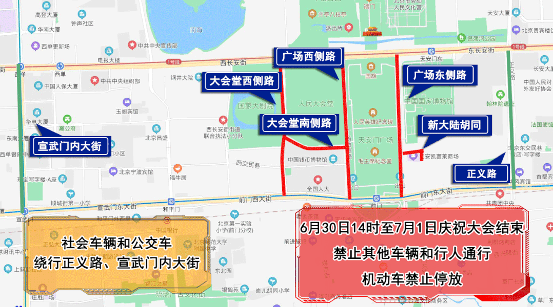 6月30日14時至7月1日慶祝大會結(jié)束,人民大會堂西側(cè)路、人民大會堂南側(cè)路、天安門廣場東側(cè)路、天安門廣場西側(cè)路、新大陸胡同,除持有慶祝大會專用證件的車輛和人員外,禁止其他車輛和行人通行,機(jī)動車禁止停放。社會車輛和公交車經(jīng)正義路、宣武門內(nèi)大街繞行。