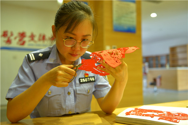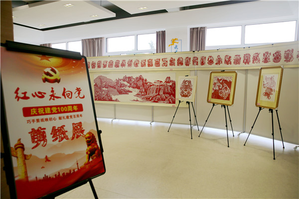 6月29日,山東出入境邊檢總站黃島出入境邊防檢查站舉辦“紅心永向黨”——慶祝建黨100周年剪紙展?!?6個民族大團結(jié)》《不忘初心 牢記使命》《光輝歷程》等近百幅作品構(gòu)圖精美、立意鮮明,映射出創(chuàng)作者對黨和祖國的熱愛。