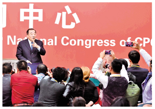 2017年10月19日,中國共產黨第十九次全國代表大會舉行記者招待會,請時任中央紀委副書記、監(jiān)察部部長、國家預防腐敗局局長楊曉渡等介紹加強黨建工作和全面從嚴治黨,堅定不移推進依規(guī)治黨,建設完善黨內法規(guī)體系的情況。李鑫 攝