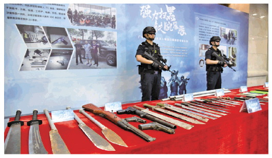 2018年1月,中共中央、國務院發(fā)布《關于開展掃黑除惡專項斗爭的通知》。三年來,全國共打掉涉黑組織3644個,黑惡犯罪得到根本遏制。圖為廣東警方查扣的涉黑涉惡團伙的涉案物品。 鄧華 攝