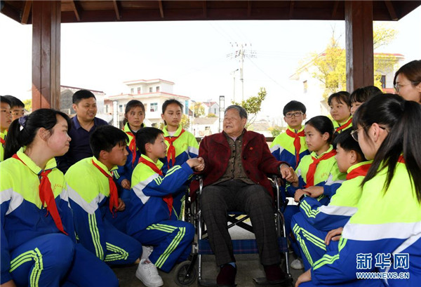 3月28日,馬毛姐回到家鄉(xiāng)安徽省無為市劉渡鎮(zhèn)馬壩村,給家鄉(xiāng)的學(xué)生們講述當(dāng)年的戰(zhàn)斗經(jīng)歷。新華社發(fā)(鄭遠(yuǎn) 攝)