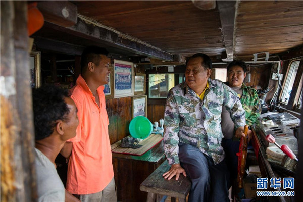 在海南省瓊海市潭門港的漁船上,王書茂(右二)與漁民交流(2018年11月14日攝)。新華社發(fā)(宋國強(qiáng) 攝)