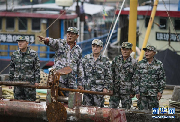 在海南省瓊海市潭門鎮(zhèn),潭門海上民兵連副連長王書茂(左二)在組織民兵開展訓(xùn)練任務(wù)(2018年12月10日攝)。新華社發(fā)(宋國強(qiáng) 攝)