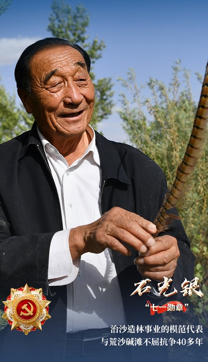 “石光銀,治沙造林事業(yè)的模范代表,40多年堅持與荒沙堿灘不屈抗爭,創(chuàng)造治沙與致富相結合的新模式,為徹底改變毛烏素沙漠南緣‘沙進人退’惡劣環(huán)境作出杰出貢獻。”這簡短的出場介紹,讓更多的人記住了這副寬厚的肩膀扛起來的不凡事業(yè),也為“治沙人”的故事寫下梗概。